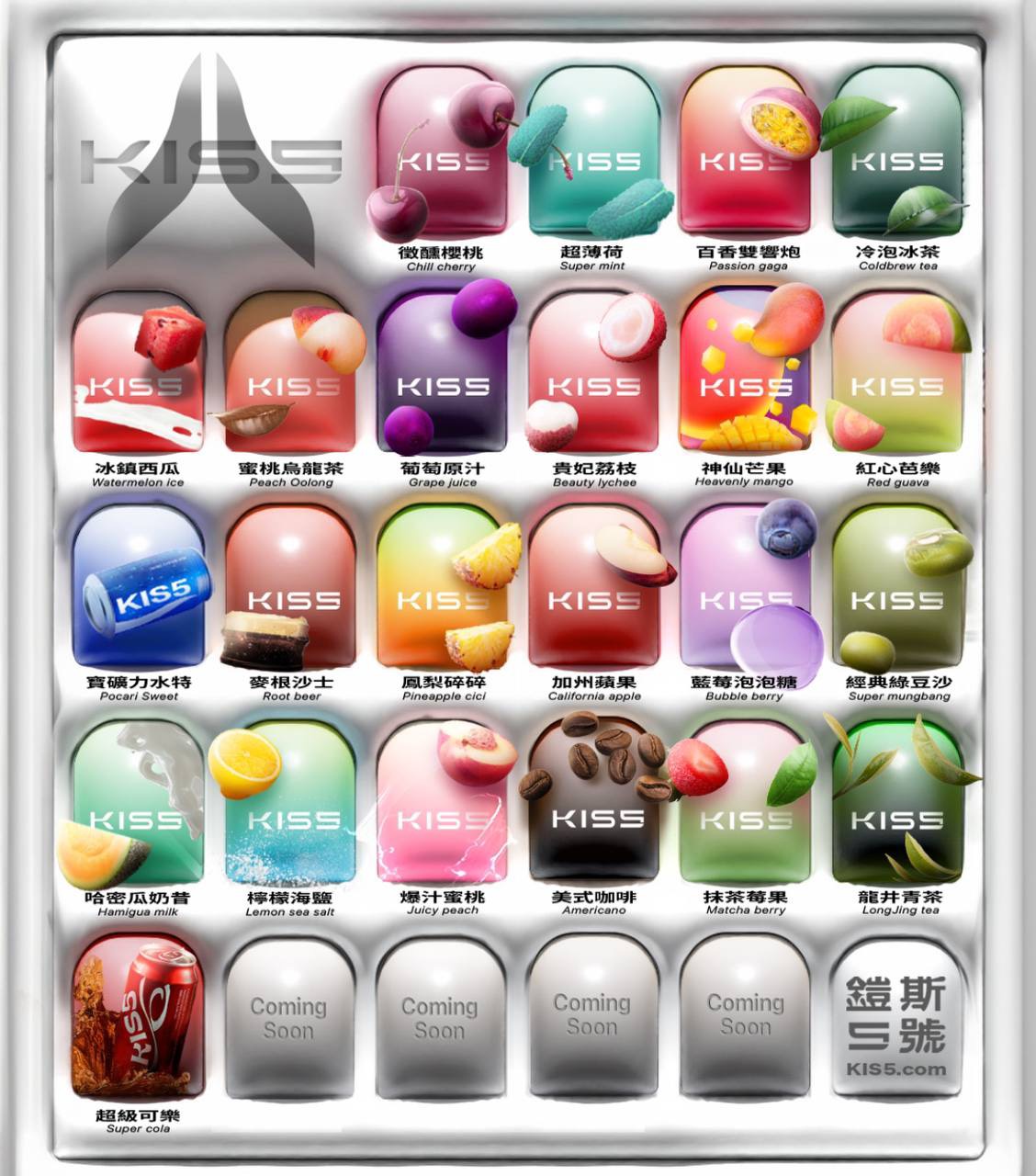 抹茶莓果, 檸檬海鹽, 麥根沙士, 貴妃荔枝, 超薄荷, 蜜桃烏龍茶, 哈密瓜奶昔, 神仙芒果, 冰鎮西瓜, 冷泡冰茶, 紅心芭樂, 葡萄原汁, 百香雙響炮, 寶礦力水得, 鳳梨碎碎, 經典綠豆沙, 藍莓泡泡糖, 加州蘋果, 爆汁蜜桃, 微醺櫻桃, 超級可樂, 龍井春茶, 美式咖啡